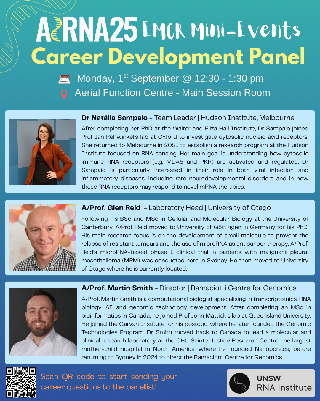The A-RNA EMCR Committee are excited to invite you to join the A-RNA 2025 EMCR Events, designed to connect, support, and celebrate our vibrant early- and mid-career researcher community. These activities will be a great chance to meet peers, gain career insights, and have some fun throughout the conference!